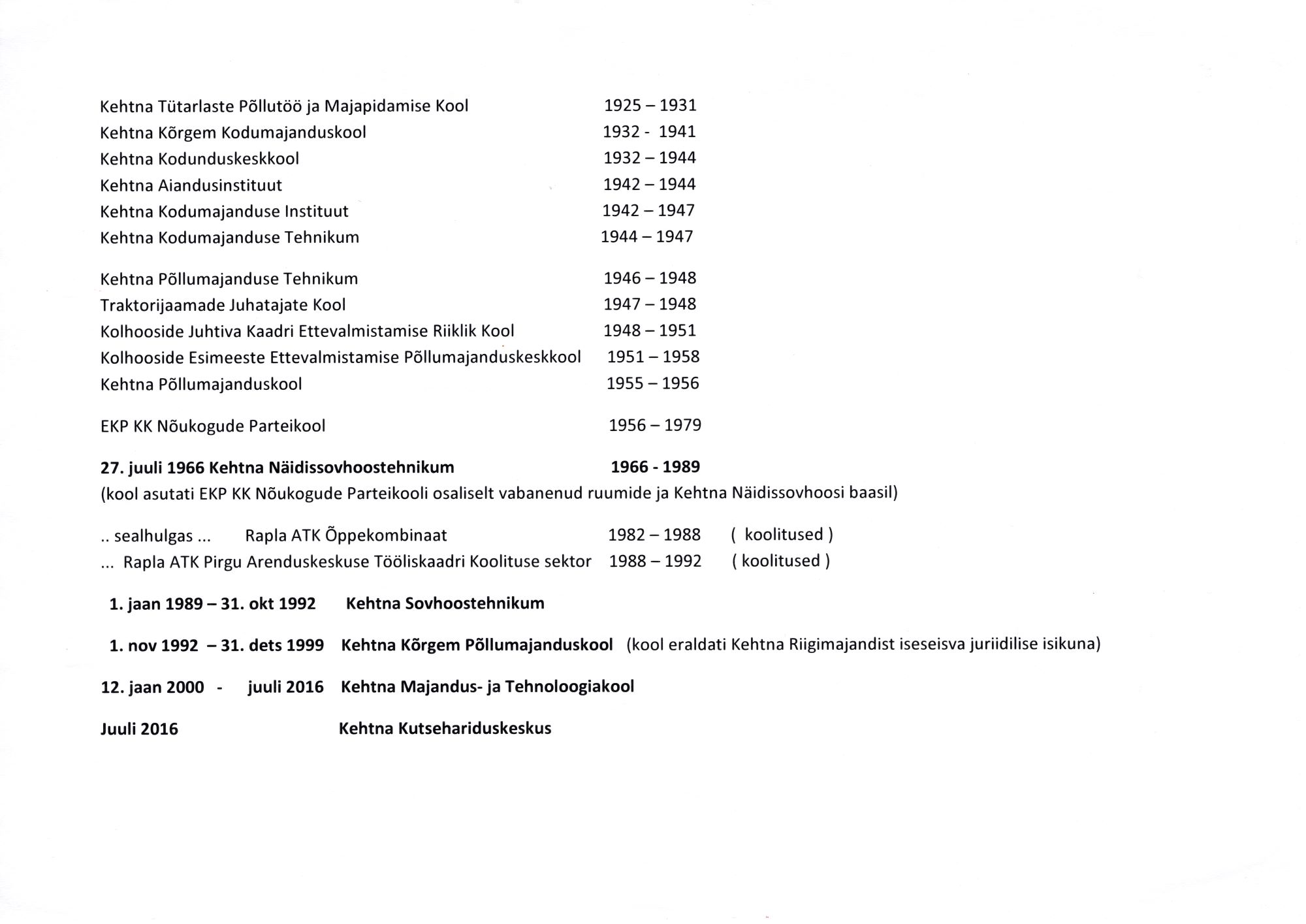Kehtna Kutsehariduskeskuse ajalugu (kronoloogia)